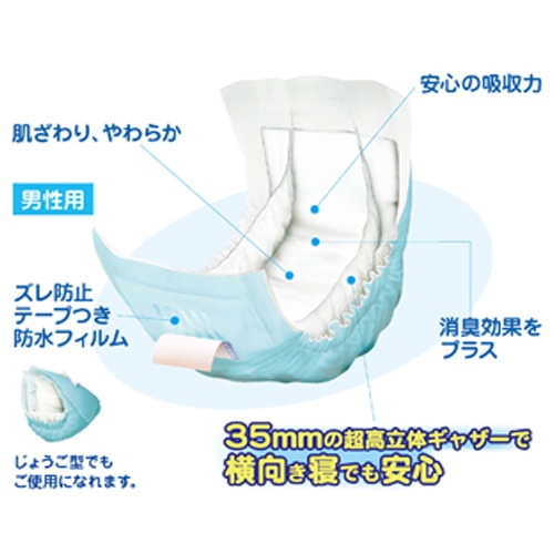 ●ギャザーの工夫でモレを防止。ふわふわパッドがお肌をやさしく包むテープ止め用パッドの男性用。