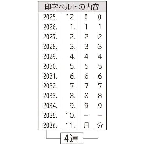 商品仕様 | ●種類/本西暦日付 ●サイズ/4号 ●書体/ゴシック体 ●備考/※メーカー都合により、印字ベルトの内容が変更になる場合があります。 |