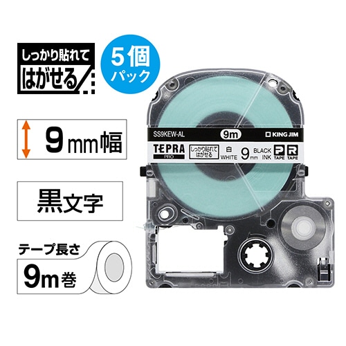 キングジム テプラ PRO テープカートリッジ しっかり貼れてはがせるラベル 9mm 白/黒文字 SS9KEW-AL-5P 1パック(5個)