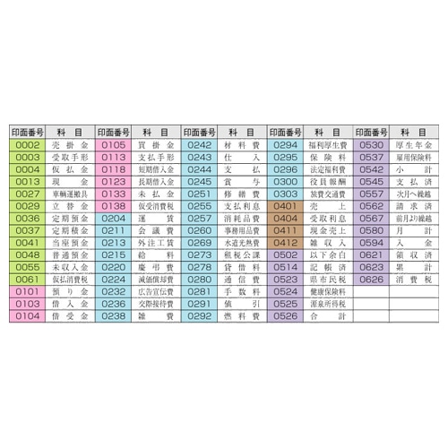 商品仕様 | ●書体/明朝体 ●印面サイズ/4×21mm ●インク色/黒 ●インク種類/油性顔料系インキ ●寸法/W28.5×D8.4×H63mm ●材質/PP ●その他仕様/●セット内容:科目印72本、印箱、3個用スタンド25個 ●備考/※印面キャップは付いていません。 ※本体色:グリーン(資産)、ブルー(損失)、ピンク(負債及び資産)、ブラウン(利益)、パープル(その他) |