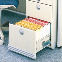 ●机の引出しにA4サイズを横向きに収納できる背幅105mmのボックスファイル、ピンクです。