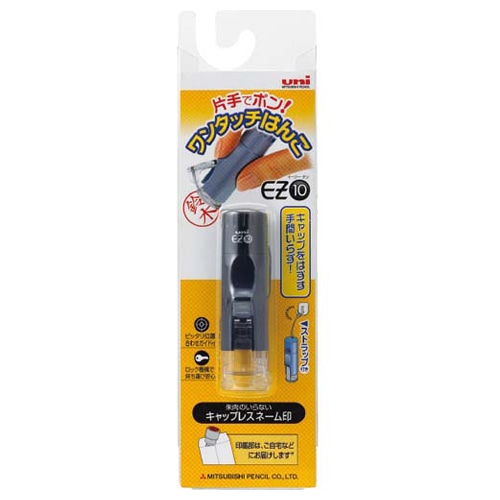 | 商品仕様 | ●書体/楷書体、行書体、古印体 ●印面サイズ/直径10mm ●文字数/4文字×2行まで ●インク色/朱色 ●本体色/黒 ●寸法/W56×D25×H188mm ●材質/再生ABS ●重量/24.5g ●備考/※サイズは、1パックあたりのサイズです。 ※商品は本体のみのお届けです。本体が届いたらインターネットか付属ハガキで印面をご注文ください。 ●シリーズ名/ユニネーム |