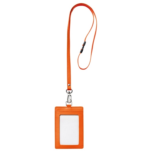 | 商品仕様 | ●色/オレンジ ●ケースサイズ/タテ112×ヨコ78mm ●適応カードサイズ/タテ85~91×ヨコ66mm ●窓サイズ/タテ80×ヨコ50mm ●ひもサイズ/10×885mm(吊り下げ金具除く) ●中紙/あり ●長さ調節/不可 ●材質/本体:牛革、金具:スチール、表示面:PVC、セーフティパーツ:ナイロン ●その他仕様/収納カード寸法厚み:2mm以内、裏面:ポケット付 ●ストラップ色/オレンジ(系) |