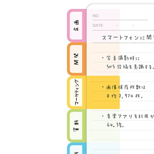 商品仕様 | ●寸法/24.5×38mm ●粘着側/短辺 ●色/ピンク、オレンジ、イエロー、グリーン、ブルー、パープル ●デザイン/インデックス ●粘着力/普通粘着 ●1パックあたり/10枚×6色 ●その他仕様/●仕様:A4縦12山 ●カラー/マルチカラー/多色 |
