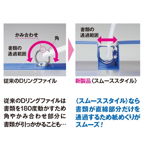 ●書類がDリング直線部分だけを通過するため、パンチ穴が傷みにくくなります。紙めくり距離が短いことで、書類をスムーズに閲覧できます。
