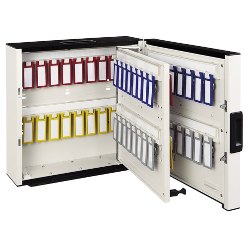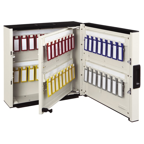 商品仕様 | ●収容数/64個 ●施錠方法/テンキータイプ ●電源/単3形乾電池4本 ●寸法/W317×D124×H310mm ●材質/本体:スチール、天地カバー・キーパネル・キーハンガー:R-ABS、キーホルダー:PP ●付属品/キーホルダー型名札(ナフ-S230B・M・R・Y)各16個、木ネジ4本、鍵2本、お試し用単3形アルカリ乾電池4本 |