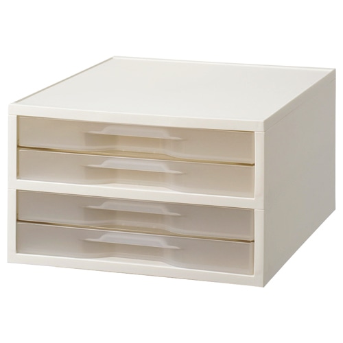 | 商品仕様 | ●段数仕様/浅型4段 ●外寸/W290×D345×H178mm ●引出内寸/約W259×D314×H28mm ●色/ホワイト&クリア ●材質/本体・引き出し:ポリプロピレン、引き出し底板:ポリスチレン ●その他仕様/最大積み重ね段数:4段、許容内容物重量:約1.0kg(引き出し1段につき)、天板最大積載質量:均等荷重で約2.0kg |