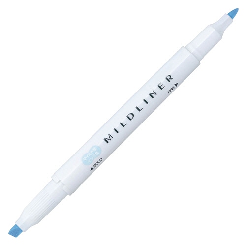 | 商品仕様 | ●タイプ/使い切りタイプ ●インク種類/水性顔料 ●インク色/マイルドブルー ●芯の太さ/太字、細字 ●芯形状/太字:角芯、細字:丸芯 ●線幅/太字:4.0mm、細字:1.0~1.4mm ●全長/141.5mm ●軸径/11.5mm ●重量/10.1g ●シリーズ名/マイルドライナー ●インクカラー/ブルー(系) |