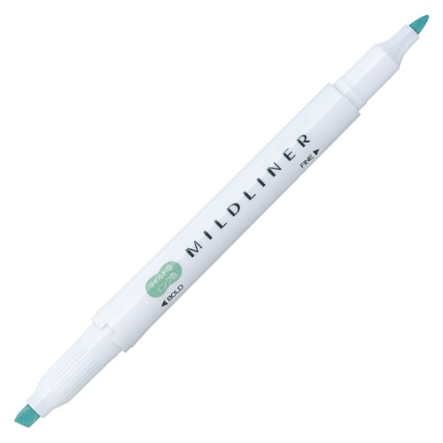 | 商品仕様 | ●タイプ/使い切りタイプ ●インク種類/水性顔料 ●インク色/マイルドブルーグリーン ●芯の太さ/太字、細字 ●芯形状/太字:角芯、細字:丸芯 ●線幅/太字:4.0mm、細字:1.0~1.4mm ●全長/141.5mm ●軸径/11.5mm ●重量/10.1g ●シリーズ名/マイルドライナー ●インクカラー/グリーン(系) |