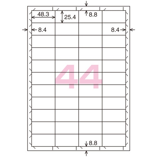 商品仕様 | ●サイズ/A4 ●シートサイズ/210×297mm ●ラベルサイズ/25.4×48.3mm ●面付け/44面 ●カット内容/四辺余白 ●総厚み/約0.16mm ●白色度/約94% ●再剥離/○ ●備考/※カラーコピー、モノクロコピー、カラーレーザー、モノクロレーザーは厚紙モード・手差し給紙でお使いください。お使いの機種によっては対応しない場合がございます。 |