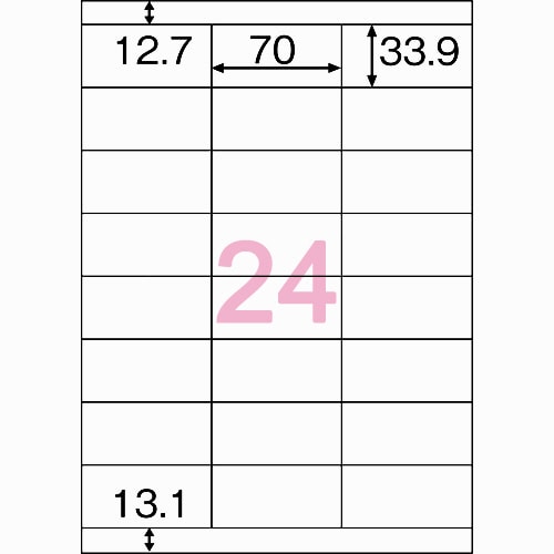 商品仕様 | ●サイズ/A4 ●シートサイズ/210×297mm ●ラベルサイズ/33.9×70mm ●面付け/24面 ●カット内容/上下余白 ●総厚み/約0.15mm ●白色度/約120% ●備考/※モノクロコピー、モノクロレーザー、カラーコピー、カラーレーザーでは、厚紙モード・手差し給紙でお使いください。お使いの機種によっては対応しない場合がございます。 ※インクジェットでは、にじみが生じる場合がございます。 |