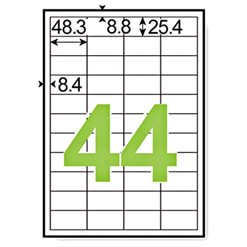 商品仕様 | ●サイズ/A4 ●シートサイズ/210×297mm ●ラベルサイズ/25.4×48.3mm ●面付け/44面 ●紙質/普通紙 ●坪量/70g/m2 ●ラベルの厚み/0.071mm ●総厚み/0.124mm ●白色度/80% ●備考/※坪量はラベル坪量です。 |