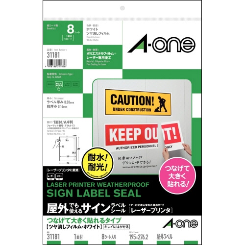 エーワン 屋外でも使えるサインラベルシール[レーザープリンタ] つなげて大きく貼れるタイプ ツヤ消しフィルム・ホワイト A4 ノーカット 31181 1冊(8シ