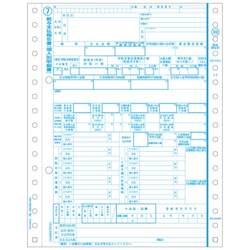 | 商品仕様 | ●様式/源泉徴収票 ●用紙タイプ/連続 ●サイズ/6 8/10×8 1/2インチ ●寸法/172.7×215.9mm ●ミシン目切り離し後サイズ/147.3×215.9mm ●刷色/1枚目:青、2枚目:黒、3枚目:黒 ●複写枚数/3枚 ●複写内訳/1枚目:給与支払報告書(個人別明細書)(市区町村提出用)、2枚目:給与所得の源泉徴収票(税務署提出用、減感加工入)、3枚目:給与所得の源泉徴収票(受給者交付用、減感加工入) ●とじ穴/2穴 ●とじ穴間隔/80mm ●備考/※東京都様式に準拠しています。他地域の方は、各提出先へお問い合わせのうえ、ご購入ください。 ※版内容は法令の改正などにより変更される場合があります。 |