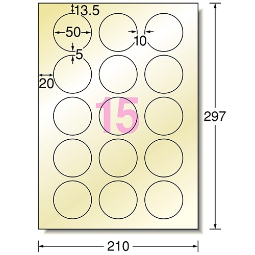 | 商品仕様 | ●サイズ/A4 ●シートサイズ/210×297mm ●面付け/15面 ●カット内容/3列×5段 ●ラベルの厚み/0.1mm ●総厚み/0.17mm ●紙色/ゴールド ●材質/ポリエステルフィルム ●水に強い/○ ●その他仕様/●ラベルサイズ:丸型・Φ50mm |