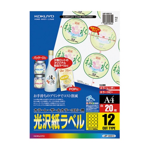 コクヨ カラーレーザー&カラーコピー用光沢紙ラベル A4 12面 直径60mm (地酒ラベル用・丸型) LBP-G6913 1冊(20シート)