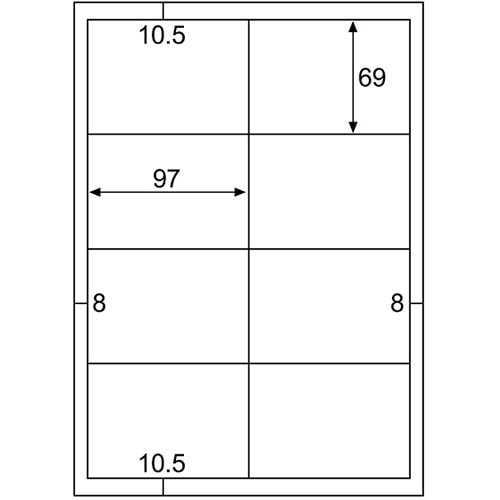 商品仕様 | ●サイズ/A4 ●シートサイズ/210×297mm ●ラベルサイズ/69×97mm ●面付け/8面 ●総厚み/約0.15mm ●白色度/約120% ●備考/※モノクロコピー、モノクロレーザー、カラーコピー、カラーレーザーでは、厚紙モード・手差し給紙でお使いください。お使いの機種によっては対応しない場合がございます。 ※インクジェットでは、にじみが生じる場合がございます。 |