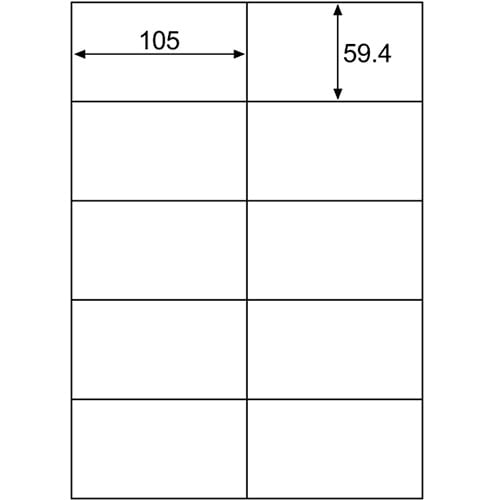 商品仕様 | ●サイズ/A4 ●シートサイズ/210×297mm ●ラベルサイズ/59.4×105mm ●面付け/10面 ●総厚み/約0.15mm ●白色度/約120% ●備考/※モノクロコピー、モノクロレーザー、カラーコピー、カラーレーザーでは、厚紙モード・手差し給紙でお使いください。お使いの機種によっては対応しない場合がございます。 ※インクジェットでは、にじみが生じる場合がございます。 |