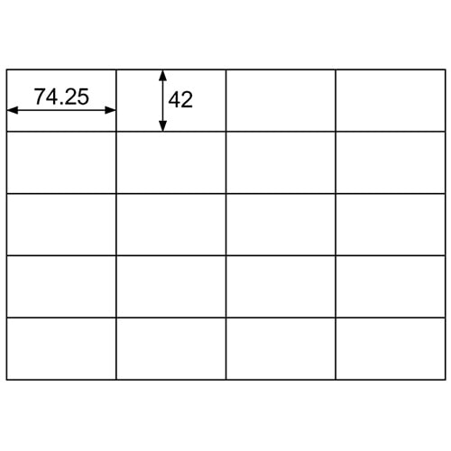 商品仕様 | ●サイズ/A4 ●シートサイズ/210×297mm ●ラベルサイズ/42×74.25mm ●面付け/20面 ●総厚み/約0.15mm ●白色度/約120% ●備考/※モノクロコピー、モノクロレーザー、カラーコピー、カラーレーザーでは、厚紙モード・手差し給紙でお使いください。お使いの機種によっては対応しない場合がございます。 ※インクジェットでは、にじみが生じる場合がございます。 |