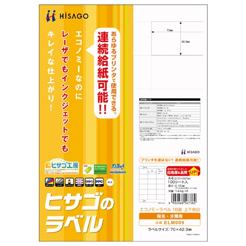 ヒサゴ エコノミーラベル A4 18面 70×42.3mm 上下余白 ELM009 1冊(100シート)