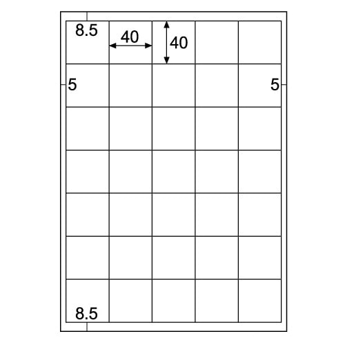 | 商品仕様 | ●サイズ/A4 ●シートサイズ/210×297mm ●ラベルサイズ/40×40mm ●面付け/35面 ●カット内容/四角シール ●総厚み/0.13mm |