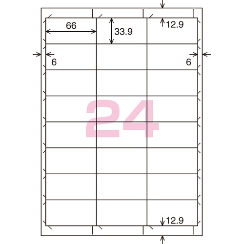 商品仕様 | ●サイズ/A4 ●シートサイズ/210×297mm ●ラベルサイズ/33.9×66mm ●面付け/24面 ●カット内容/四辺余白 ●坪量/134g/m2 ●ラベルの厚み/0.07mm ●総厚み/0.14mm ●白色度/約95% ●古紙パルプ配合率/70% ●備考/※カラーコピー、モノクロコピー、カラーレーザー、モノクロレーザーは厚紙モード・手差し給紙でお使いください。お使いの機種によっては対応しない場合がございます。 |