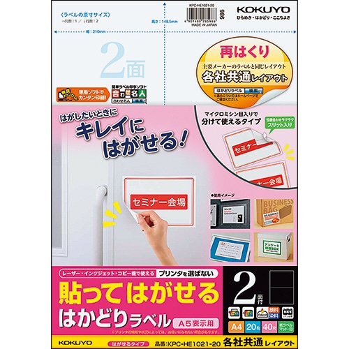 コクヨ 貼ってはがせる はかどりラベル(各社共通レイアウト) A4 2面 148.5×210mm KPC-HE1021-20 1冊(20シート)