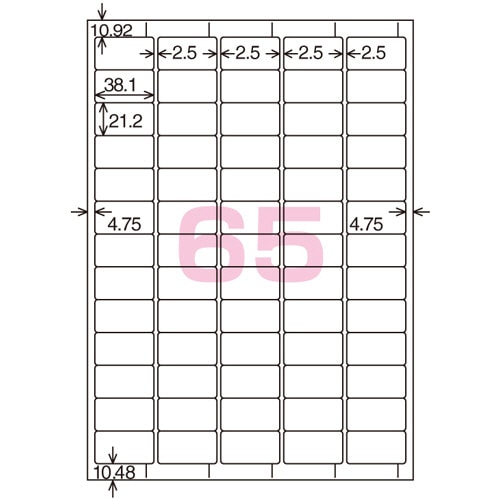 商品仕様 | ●サイズ/A4 ●シートサイズ/210×297mm ●ラベルサイズ/21.2×38.1mm ●面付け/65面 ●カット内容/四辺余白(角丸) ●総厚み/約0.16mm ●白色度/約94% ●再剥離/○ ●備考/※カラーコピー、モノクロコピー、カラーレーザー、モノクロレーザーは厚紙モード・手差し給紙でお使いください。お使いの機種によっては対応しない場合がございます。 |