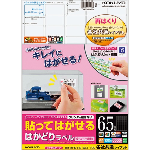 コクヨ 貼ってはがせる はかどりラベル(各社共通レイアウト) A4 65面 21.2×38.1mm KPC-HE1651-100N 1冊(100シート)