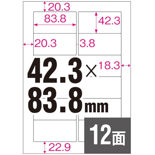 商品仕様 | ●サイズ/A4 ●シートサイズ/210×297mm ●ラベルサイズ/42.3×83.8mm ●面付け/12面 ●カット内容/四辺余白(角丸) ●紙質/上質紙 ●総厚み/約0.19mm ●白色度/約103% ●再剥離/○ ●備考/※カラーコピー・カラーレーザープリンタは厚紙モード・手差し給紙でお使いください。お使いの機種によっては対応しない場合がございます。 ※インクジェットプリンタはにじみが生じる場合がございます。 |