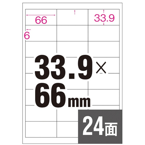 商品仕様 | ●サイズ/A4 ●シートサイズ/210×297mm ●ラベルサイズ/33.9×66mm ●面付け/24面 ●カット内容/四辺余白 ●紙質/上質紙 ●総厚み/約0.19mm ●白色度/約103% ●再剥離/○ ●備考/※カラーコピー・カラーレーザープリンタは厚紙モード・手差し給紙でお使いください。お使いの機種によっては対応しない場合がございます。 ※インクジェットプリンタはにじみが生じる場合がございます。 |