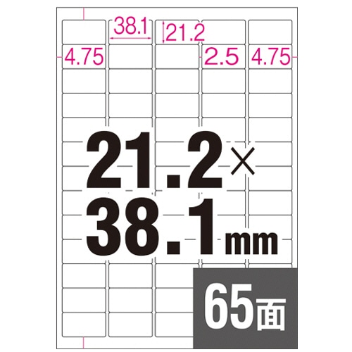 商品仕様 | ●サイズ/A4 ●シートサイズ/210×297mm ●ラベルサイズ/21.2×38.1mm ●面付け/65面 ●カット内容/四辺余白(角丸) ●紙質/上質紙 ●総厚み/約0.19mm ●白色度/約103% ●再剥離/○ ●備考/※カラーコピー・カラーレーザープリンタは厚紙モード・手差し給紙でお使いください。お使いの機種によっては対応しない場合がございます。 ※インクジェットプリンタはにじみが生じる場合がございます。 |