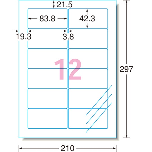 商品仕様 | ●サイズ/A4 ●シートサイズ/210×297mm ●ラベルサイズ/42.3×83.8mm ●面付け/12面 ●カット内容/四辺余白(角丸) ●紙質/ポリエステルフィルム ●総厚み/0.15mm ●紙色/透明 ●備考/※厚紙モード・手差し給紙でお使いください。お使いの機種によっては対応しない場合がございます。 |