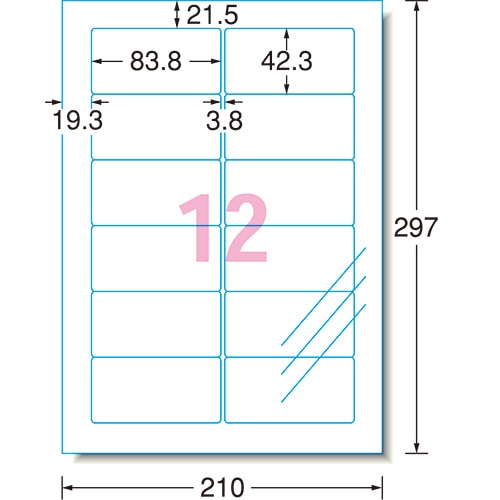 | 商品仕様 | ●サイズ/A4 ●シートサイズ/210×297mm ●ラベルサイズ/42.3×83.8mm ●面付け/12面 ●カット内容/四辺余白(角丸) ●紙質/ポリエステルフィルム ●総厚み/0.15mm ●紙色/透明 ●備考/※顔料インクには非対応です。 |