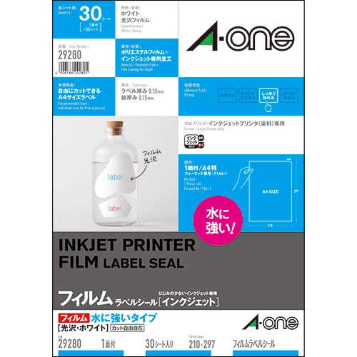 エーワン ラベルシール[インクジェット] 水に強いタイプ 光沢フィルム・ホワイト A4 ノーカット 29280 1冊(30シート)