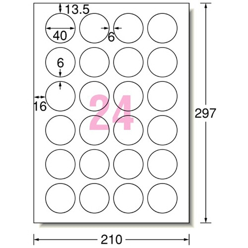 商品仕様 | ●サイズ/A4 ●シートサイズ/210×297mm ●ラベルサイズ/Φ40×mm ●面付け/24面 ●カット内容/四辺余白(丸型) ●紙質/マット紙 ●ラベルの厚み/0.11mm ●総厚み/0.22mm ●紙色/ホワイト ●材質/上質紙 ●水に強い/○ ●その他仕様/●超耐水 ●備考/※顔料インクの場合、インクの乾燥には時間がかかります。 |