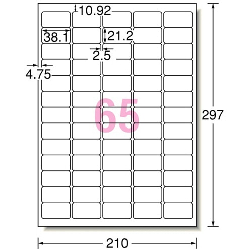 商品仕様 | ●サイズ/A4 ●シートサイズ/210×297mm ●ラベルサイズ/21.2×38.1mm ●面付け/65面 ●カット内容/四辺余白(角丸) ●紙質/光沢紙 ●ラベルの厚み/0.11mm ●総厚み/0.22mm ●紙色/ホワイト ●材質/合成紙 ●水に強い/○ ●その他仕様/●超耐水 ●備考/※顔料インクの場合、インクの乾燥には時間がかかります。 |