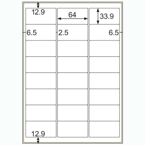 商品仕様 | ●サイズ/A4 ●ラベルサイズ/33.9×64mm ●面付け/24面 ●総厚み/0.23mm ●紙色/白 ●材質/PETフィルム ●水に強い/○ ●屋外用/○ ●その他仕様/●油のついた面にも貼れるタイプ ●備考/※お使いの機種によっては対応しない場合がございます。 |