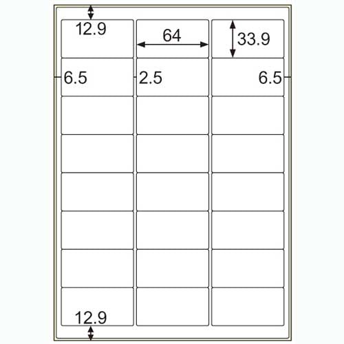 | 商品仕様 | ●サイズ/A4 ●ラベルサイズ/33.9×64mm ●面付け/24面 ●カット内容/角丸余白付 ●総厚み/0.23mm ●紙色/白 ●材質/PETフィルム ●水に強い/○ ●屋外用/○ ●その他仕様/●水滴がついた面にも貼れるタイプ ●備考/※お使いの機種によっては対応しない場合がございます。 |