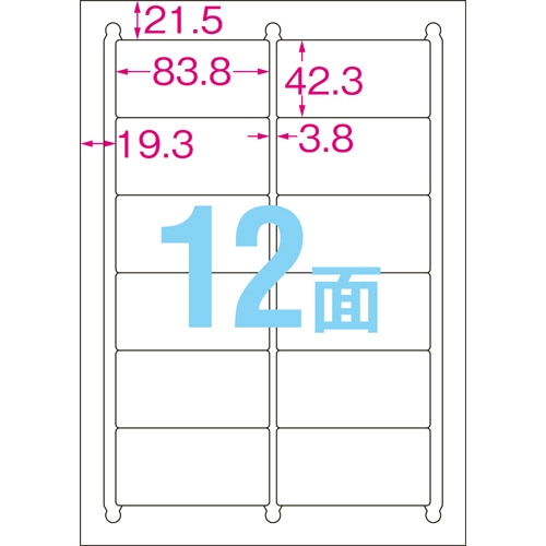 商品仕様 | ●サイズ/A4 ●ラベルサイズ/42.3×83.8mm ●面付け/12面 ●カット内容/角丸 ●紙質/上質紙 ●総厚み/0.19mm ●備考/※厚紙モード・手差し給紙でお使いください。 ※お使いの機種によっては対応しない場合がございます。 |
