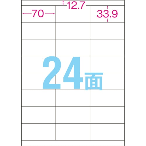 商品仕様 | ●サイズ/A4 ●ラベルサイズ/33.9×70mm ●面付け/24面 ●カット内容/上下余白 ●紙質/上質紙 ●総厚み/0.19mm ●備考/※厚紙モード・手差し給紙でお使いください。 ※お使いの機種によっては対応しない場合がございます。 |