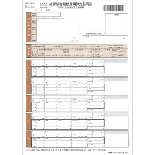 | 商品仕様 | ●様式/被保険者報酬月額算定基礎届 ●用紙タイプ/カット紙 ●サイズ/A4 ●寸法/210×297mm ●対応ソフト/スマイルシリーズ |