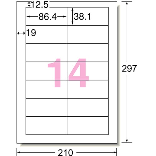 商品仕様 | ●サイズ/A4 ●シートサイズ/210×297mm ●ラベルサイズ/38.1×86.4mm ●面付け/14面 ●カット内容/四辺余白 ●紙質/上質紙 ●総厚み/0.15mm ●白色度/80% ●その他仕様/●手書き対応 ●備考/※厚紙モード・手差し給紙でお使いください。機種によっては対応しない場合がございます。 |