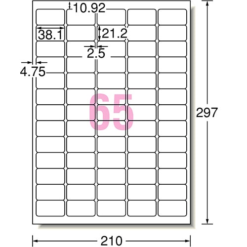 | 商品仕様 | ●サイズ/A4 ●シートサイズ/210×297mm ●ラベルサイズ/21.2×38.1mm ●面付け/65面 ●カット内容/四辺余白(角丸) ●紙質/上質紙 ●総厚み/0.15mm ●白色度/80% ●その他仕様/●手書き対応 ●備考/※厚紙モード・手差し給紙でお使いください。機種によっては対応しない場合がございます。 |