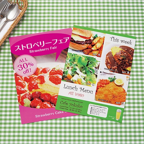 ●かさばらない薄手タイプ/紙厚0.14mmでかさばらないので、複数枚のメニューやチラシ、案内状に好適です。