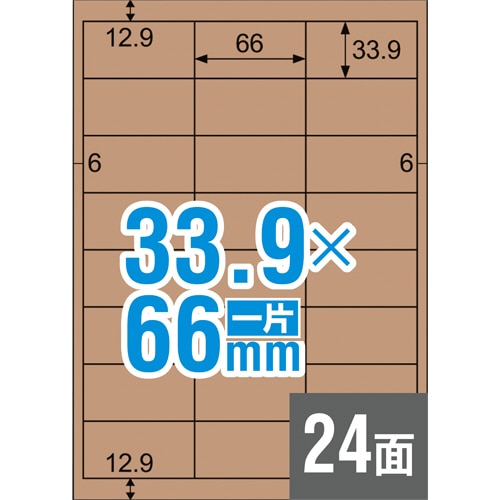 商品仕様 | ●サイズ/A4 ●シートサイズ/210×297mm ●ラベルサイズ/33.9×66mm ●面付け/24面 ●紙質/クラフト紙 ●総厚み/0.22mm ●紙色/ダークブラウン |