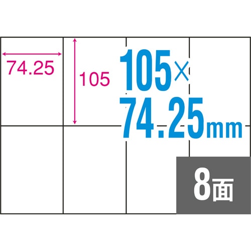 商品仕様 | ●サイズ/A4 ●シートサイズ/210×297mm ●ラベルサイズ/74.25×105mm ●面付け/8面 ●紙質/上質紙 ●総厚み/約0.15mm ●白色度/約120% ●備考/※コピー、レーザーは厚紙モード・手差し給紙でお使いください。機種によっては対応しない場合がございます。 ※インクジェットはにじみが生じる場合がございます。 |