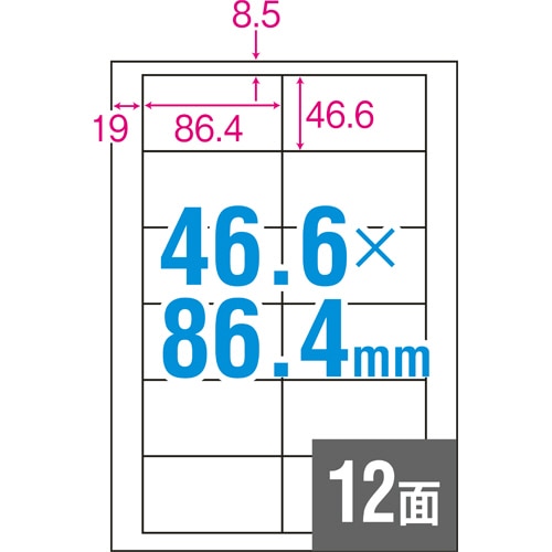 | 商品仕様 | ●サイズ/A4 ●シートサイズ/210×297mm ●ラベルサイズ/46.6×86.4mm ●面付け/12面 ●紙質/上質紙 ●総厚み/約0.15mm ●白色度/約120% ●備考/※コピー、レーザーは厚紙モード・手差し給紙でお使いください。機種によっては対応しない場合がございます。 ※インクジェットはにじみが生じる場合がございます。 |