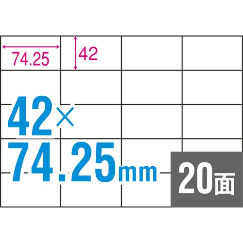 商品仕様 | ●サイズ/A4 ●シートサイズ/210×297mm ●ラベルサイズ/42×74.25mm ●面付け/20面 ●紙質/上質紙 ●総厚み/約0.15mm ●白色度/約120% ●備考/※コピー、レーザーは厚紙モード・手差し給紙でお使いください。機種によっては対応しない場合がございます。 ※インクジェットはにじみが生じる場合がございます。 |