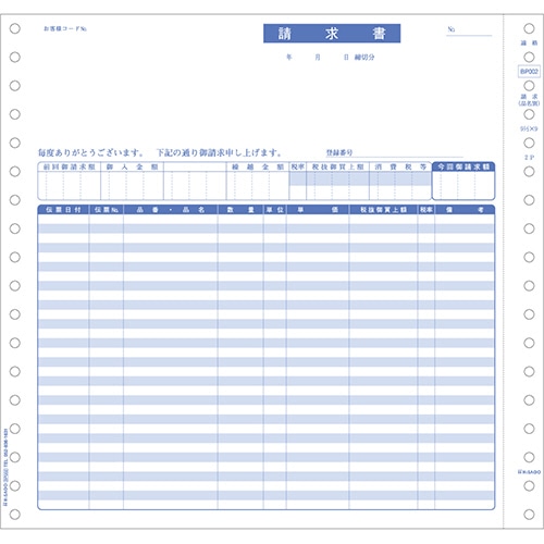 | 商品仕様 | ●様式/請求書 ●用紙タイプ/連続 ●寸法/241×229mm ●ミシン目切り離し後サイズ/224×229mm ●刷色/群青 ●複写枚数/2枚 ●複写内訳/1枚目:請求書、2枚目:請求書 ●フィーダ穴/18穴 ●その他仕様/●サイズ:9_1/2×9インチ ●ミシン目切り離し後サイズ:8_8/10×9インチ |